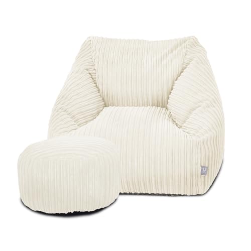 rucomfy Beanbags Big Kids Snuggle Chair - Large Corduroy Armchair for Kids & Teenagers - Home Furniture Living Room or Bedroom Seating - Machine Washable - 70 x 80 x 60cm (Ivory, with Footstool)