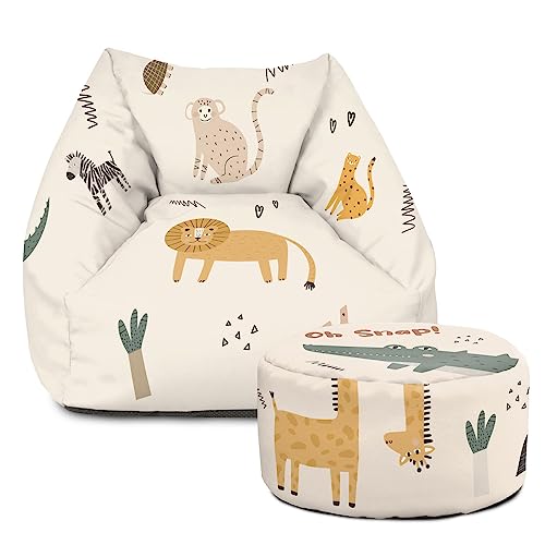 rucomfy Beanbags Snuggle Kids Bean Bag Chair - Small Armchair Beanbag Seat - Childrens Bedroom Furniture for Boys and Girls - Arrives with Filling - 50 x 46 x 48cm (Safari Friends, Matching Footstool)