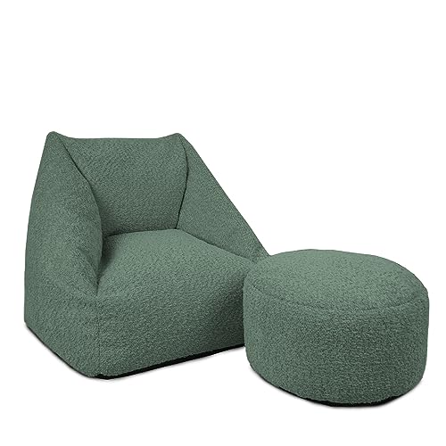 rucomfy Beanbags Kids Boucle Bean Bag Chair with Filling - Childrens Neutral Colour Beanbag Seat Bedroom Furniture - Toddler Armchair Seat with Footstool for Boys & Girls - 50 x 46 x 48cm (Moss)