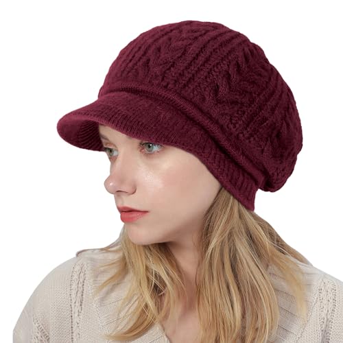 Hebenie Beanie Hats for Women - Winter Warm Knitted Beanie Cap 2023 Ladies Fleece Lined Beret Hat Thermal Wooly Hats Crochet Peaked Baker Boy Hat for Women Girls UK Red