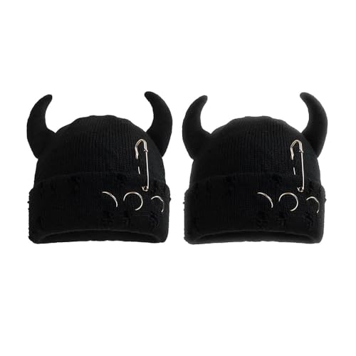 FUYAO Devil Horn Knit Beanie Hat for Women Men Kids Stretchy Winter Warm Hat Funny Halloween Party Hats Hip Hop Skullies Cap (UK, Alpha, One Size, 2pcs Black)