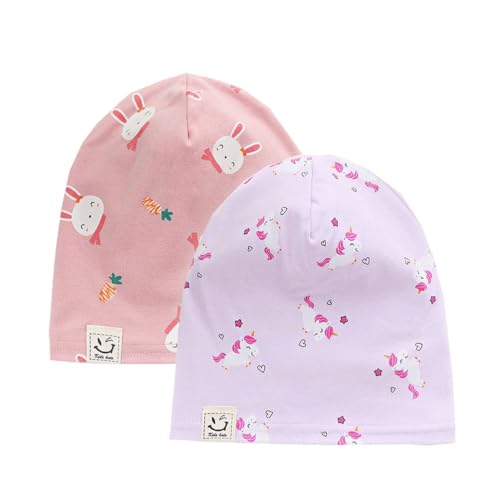 FUYAO Baby Beanie Hat 2 Pack Toddler Kids Soft Cotton Skull Cap Little Boys Girls Warm Hats for Spring Autumn (UK, Age, 1 Year, 6 Years, Unicorn Purple + Bunny Pink)
