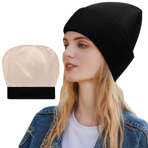Risipu Womens Satin Lined Knit Beanie Hat Acrylic Winter Hats for Women Men Silk Lining Soft Slouchy Warm Cuffed Beanie Hat (UK, Alpha, One Size, Black)