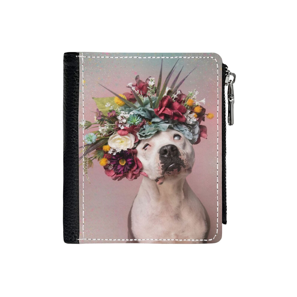 (Pit Bull Flower Power, Halo_255) PU Wallet Compact Bifold with Zipper & Multiple Card Coins Slots Black Stylish Durable Graphic Design Print for Men