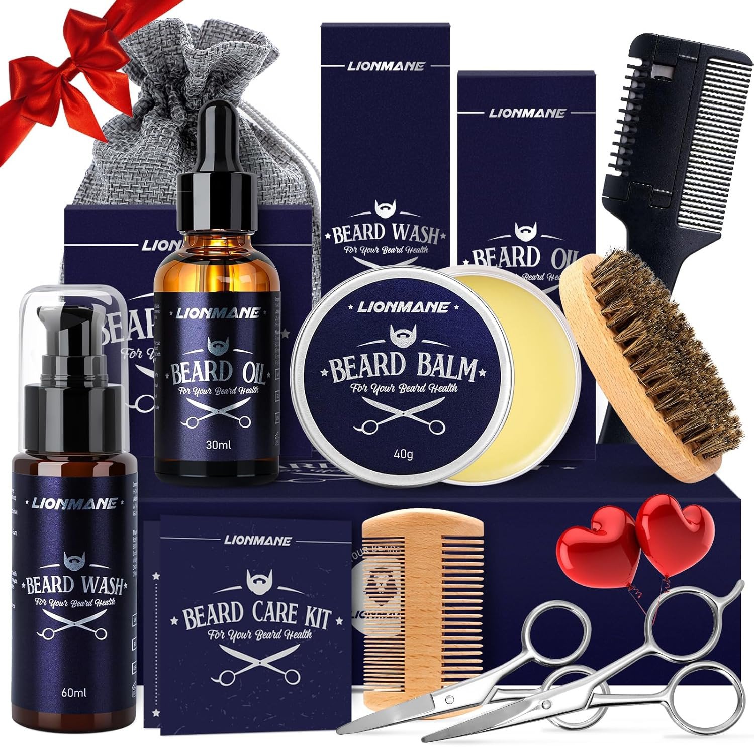 Beard Care Kit for Men LIONMANE Beard Grooming Kit Beard Balm Beard Wash Oil Comb Brush Scissors Hair Thinning CombBeard Trimming SetAnniversary