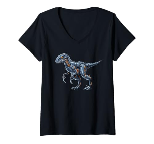 Womens Robotic Raptor Dinosaur Cyber Mech Predator Design V-Neck T-Shirt