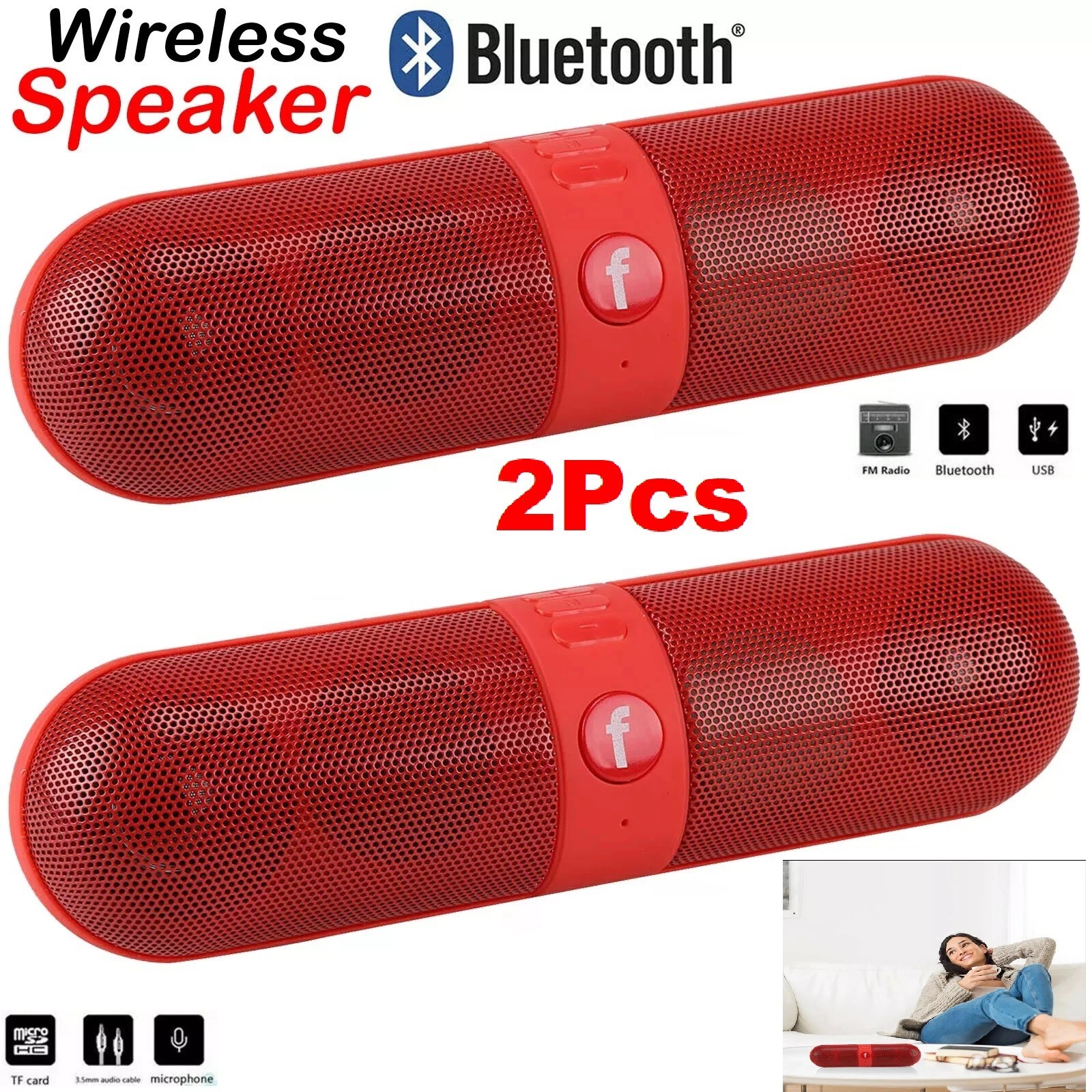 2x Portable Pill Shaped Bluetooth Speaker Wireless Loud Beats Travel Speaker TF