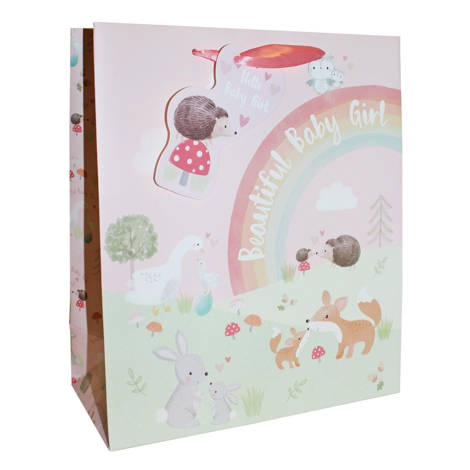 Beautiful Baby Girl Gift Bag with Tag - 25.5cm x 21.5cm Woodland Creatures Pink