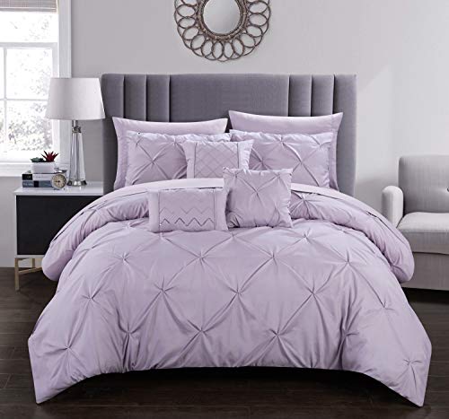 Chic Home Pinch, Ruffled and Pleated Complete Bed in a Bag Comforter Sheets Set and Deocrative Pillows Included, Cotton, Lavender, Queen