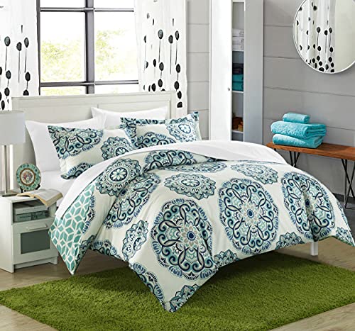 Chic Home Green Reversible Bed in a Bag Duvet Cover Set, Full/Queen Size (3 Piece), Ibiza - Medallion Boho Pattern Microfiber Bedding with Geometric Printed Backing - Duvet & Pillow Shams