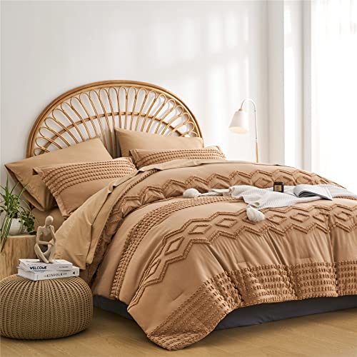 KAKIJUMN Khaki Tufted Comforter Set Queen Size 7 Piece Bed in a Bag, Shabby Chic Boho Comforter and Sheet Set, All Season Soft Microfiber Complete Bedding Set(Khaki,Queen)