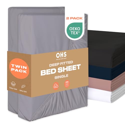 Brentfords Single Fitted Sheets 2 Pack, Deep Fitted Sheet Bed Cover Easy Care Fade Resistant Ultra Soft Bed Sheet Linen Microfibre Single Sheets - Grey
