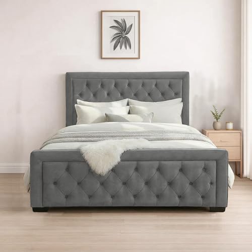 Grey King Size Bed with Mattress Included | Plush Upholstered King Size Bed Frame with Chesterfield Headboard & Footboard | Bedroom Furniture | Bed & Mattress Sets