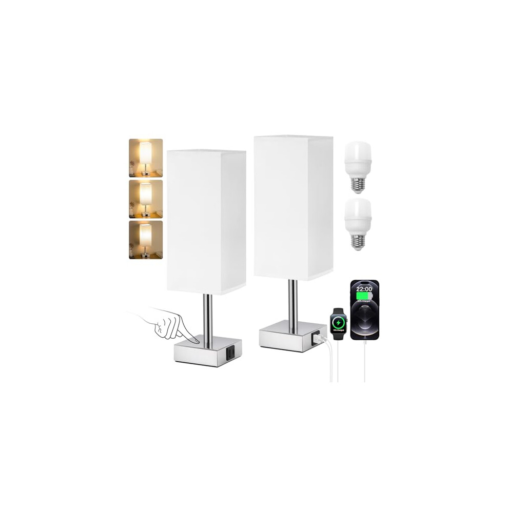 Touch Control Bedside Lamps Set of 2, 3-Way Dimmable Table Lamp with USB-C+A Charging Ports, Bed Side Lamps for Bedroom with White Fabric Shade(Bulbs Included)