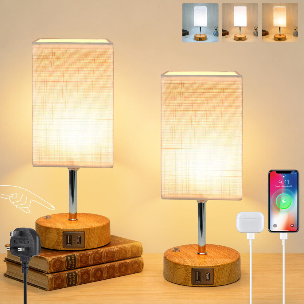 Wudyfei Touch Bedside Lamps, Small Dimmable Table Lamp with Wood Grained Base & Fabric Shade, 3 Colour LED Minimalist Bed Side Nightstand Lamp for