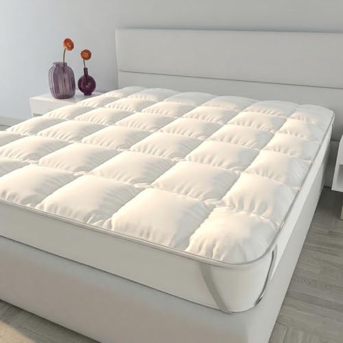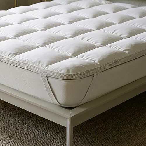 Extra Thick Mattress Topper Double Bed 100% Cotton Cover, Soft Mattress Bed Topper Pad with Elastic Anchor Corner Straps, Baffle Box Stitched for