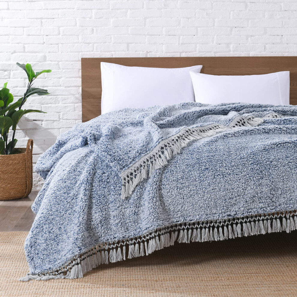 Ultra Soft Fleece Sherpa Blanket King Size Lightweight Cozy Boho Bed Blanket with Decorative Tassel Pattern Reversible 2 Tones