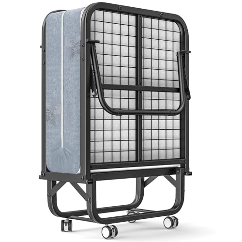 MOBYGKFY Folding Bed with Mattress Foldable Guest Bed with 4-Inch Mattress 4 Wheels Portable Fold Up Bed for Adults
