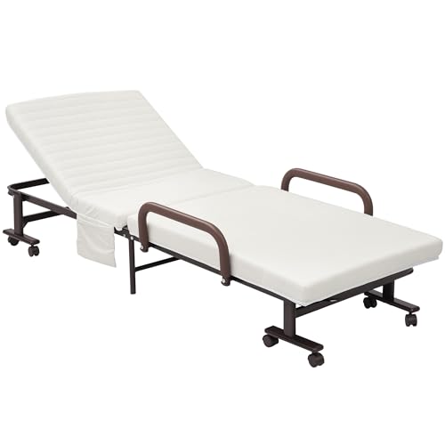 MOBYGKFY Folding Bed with Mattress Portable Guest Bed W/Adjustable Position Side Storage Pocket Fold Up Bed on Wheels