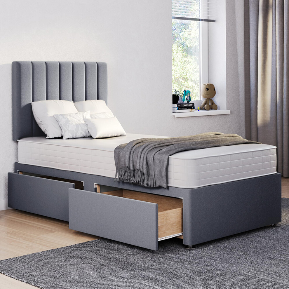 ComfoRest - 5ft Divan Bed - WITH MATTRESS INCLUDED - King Size Divan Bed - With 24" Headboard + 2 Drawers Storage - Bed & Mattress Set (Silver Plush)