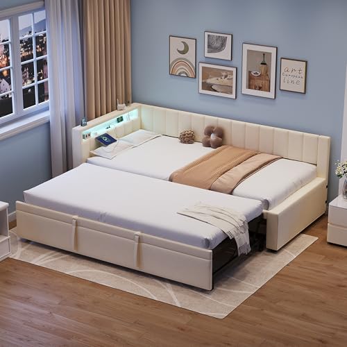 Huayz Day Bed 90x190cm,Upholstered Single Sofa Bed with Trundle,with RGB LED Lighting,3ft,Pull Out Bed,Daybed for Adults & Teenagers,Velvet, Beige
