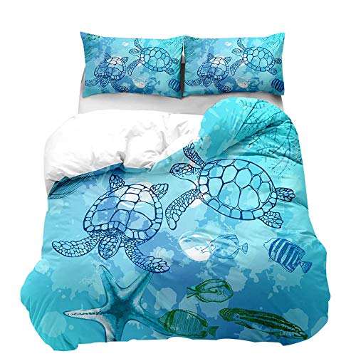 Loussiesd Turtle Duvet Cover Set Single Size 3D Print Sea Animal Bedding Set Blue Starfish Comforter Cover Soft Microfiber Polyester with 2 Pillow Shams, Zipper, Marine Life, 3 Pieces