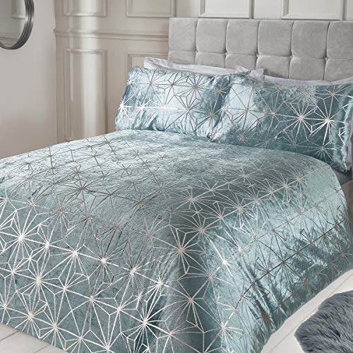 Sleepdown Geometric Duvet Cover with Pillow Cases Luxury Silver Shimmer Sparkle Velvet Bedding Set-Blue-Super King (220cm x 260cm), Polyester
