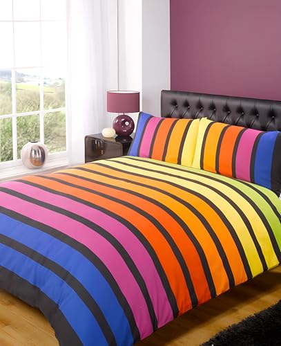 Rapport SoHo Multi Stripe Duvet Cover Quilt Bedding Set, Blue Purple Orange Yellow Green, Double Size - Bedroom Bed Linen