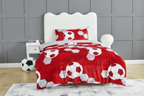 GC GAVENO CAVAILIA Football Bedding Single Teady Fleece Duvet Cover Set (135x200 cm) - Breathable Kids Bed Cover With Pillowcase - Red Duvet Set Washable Linen