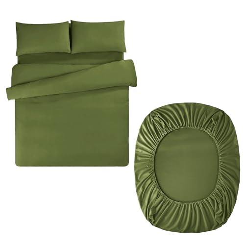 Aisbo Double Duvet Set with Sheet - Olive Green 4 Pieces Microfiber Bedding Set for Double Bed, Includes Duvet Cover, Fitted Sheet and Pillowcases