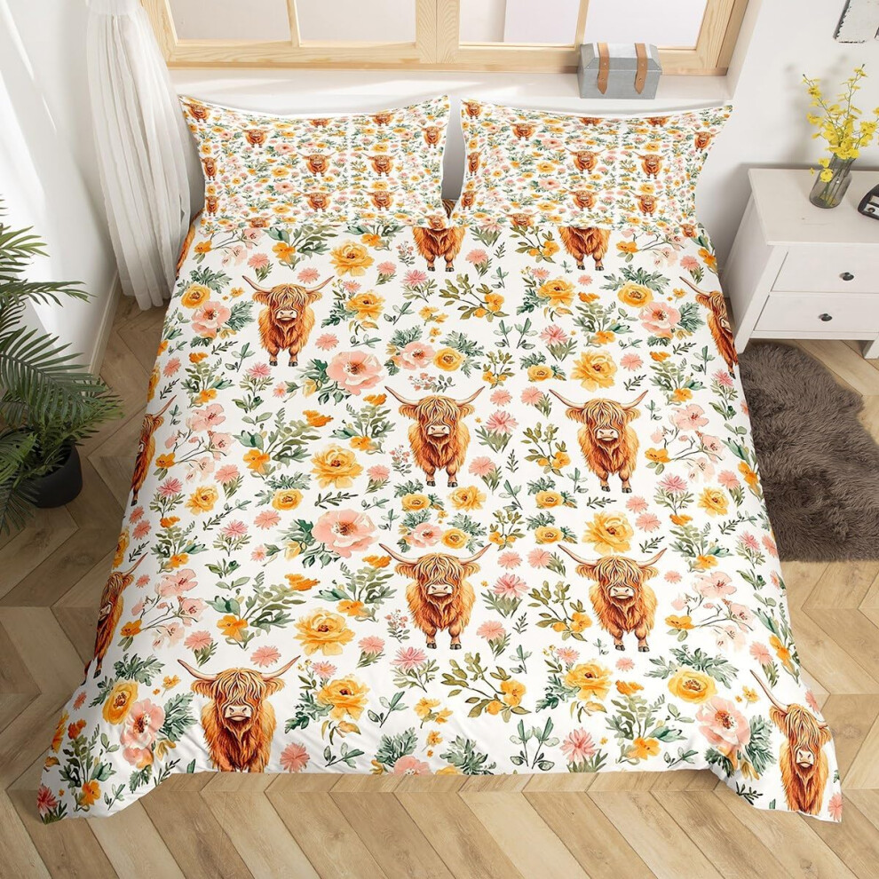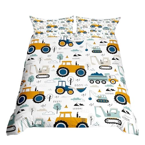 Homewish Construction Bedding Double for Teenage Boy, Kids Cartoon Cars Duvet Cover Double Size, Equipment Trucks Quilt Cover 3Pcs, Excavator Tractor Duvet Cover Set, White Yellow Bedroom Decor