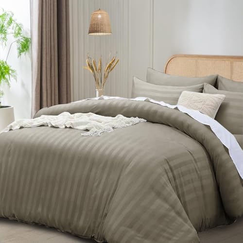 funky gadgets Super King Duvet Cover Set Beige, Microfiber Satin Stripe Duvet Cover Luxury Hotel Bedding Sets with Pillowcases Breathable Ultra Soft Reversible Quilt Covers.