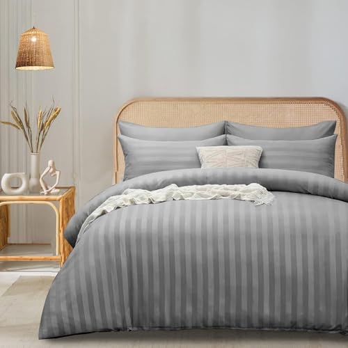 funky gadgets Super King Duvet Cover Set Grey, Microfiber Satin Stripe Duvet Cover Luxury Hotel Bedding Sets with Pillowcases Breathable Ultra Soft Reversible Quilt Covers.