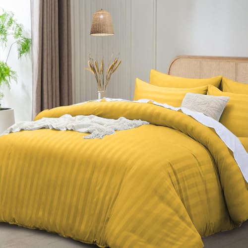 funky gadgets Single Duvet Cover Set Ochre, Microfiber Satin Stripe Duvet Cover Luxury Hotel Satin Bedding Sets with Pillowcase Breathable Ultra Soft Reversible Quilt Covers.