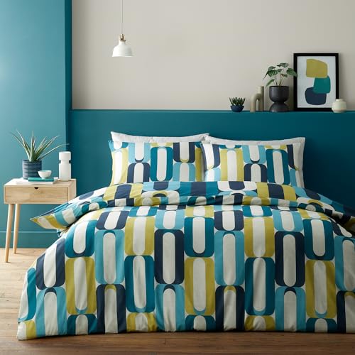 Fusion - 70s Retro Shapes Blue Duvet Cover - Double Bedding Size (200 x 200cm) - Funky Hula Hoops Bed Set - Easy Care & Washable - Blue Duvet Cover w/Geometric Circle Print - Vector Retro Inspired