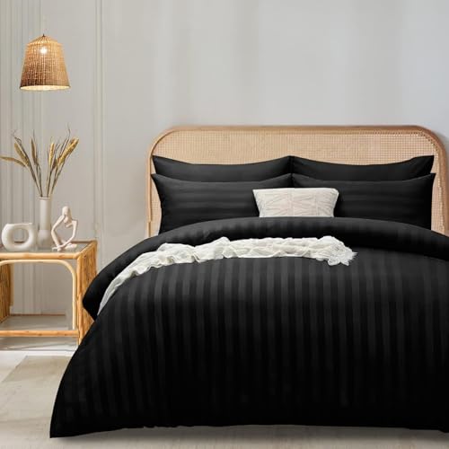 funky gadgets Super King Duvet Cover Set Black, Microfiber Satin Stripe Duvet Cover Luxury Hotel Bedding Sets with Pillowcases Breathable Ultra Soft Reversible Quilt Covers.