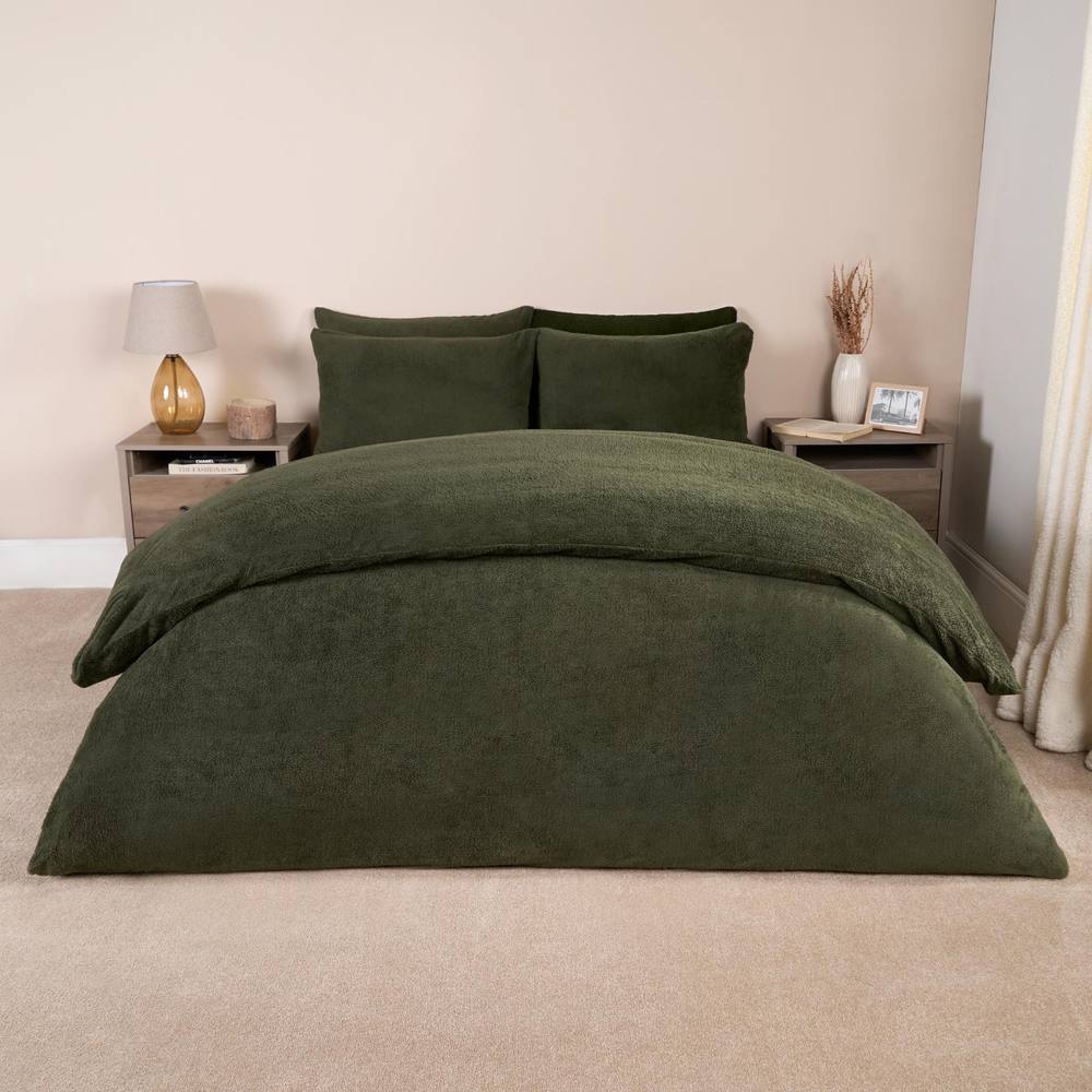 OHS Thermal Soft Teddy Fleece Duvet Cover Bedding Set in Dark Green | Size: Super King