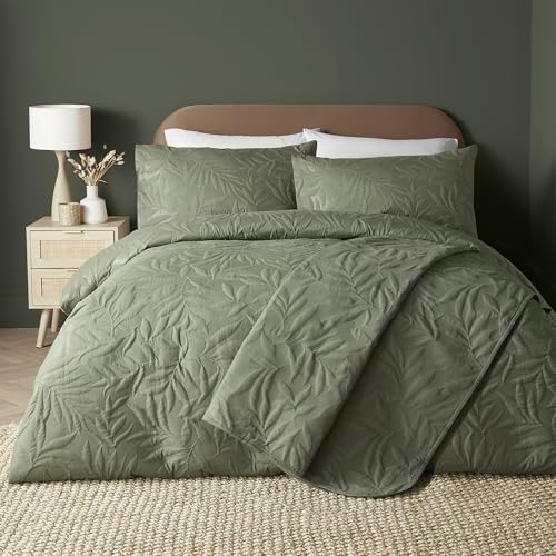 Serene - Khaki Green Leaf Embossed Duvet Cover - Double Bedding Size (200 x 200cm) - Soft Touch - Leaf/Leaves Embroidery Duvet Cover in Khaki Green - Luxury Bedding Set - Luana Collection