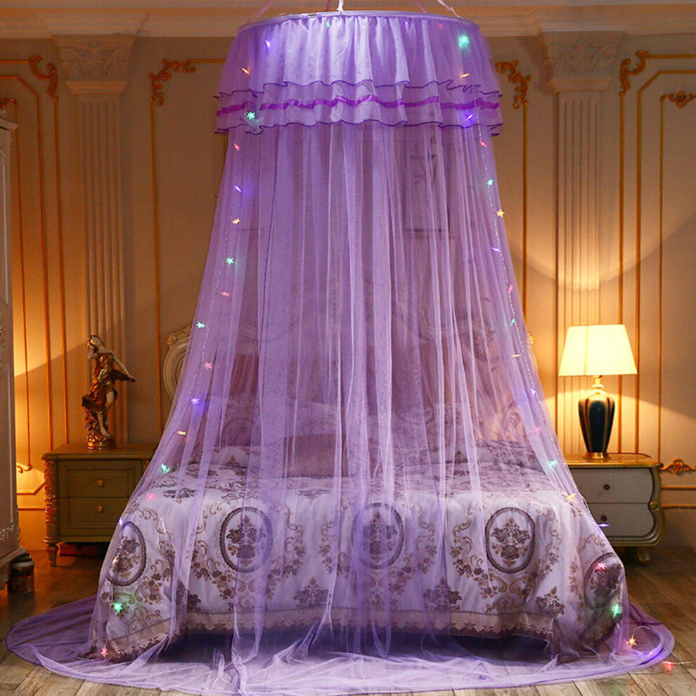 (Purple) Mosquito Net Bedding Lace LED Light Princess Dome Mesh Bed Canopy Bedroom Decor