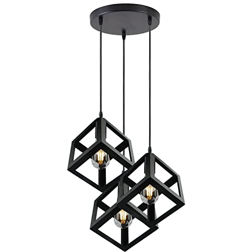 LEDSone 3 Lights Vintage Pendant Light, E27 Black Square Cage Shaped Shades Industrial Kitchen Lights Ceiling Pendant Lights Ideal for Bedroom Living Dining Room Hallway