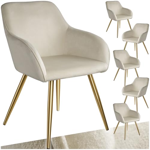 tectake® Set of 6 Dining Chairs in Velvet Look with Gold Steel Legs, Thickly Padded Armchairs, Ergonomic Design & Easy Assembly - Ideal as Dining, Living Room, Bedroom & Desk Chairs - Cream/Gold