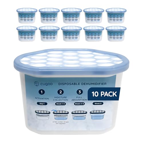 CUQOO Disposable Dehumidifier for Home 500ml, Pack of 10 Moisture Absorber Dehumidifiers for Damp, Mould, Kitchen, Wardrobe, Bedroom, Caravan, Office, Garage, Bathroom - Mini Condensation Absorbers