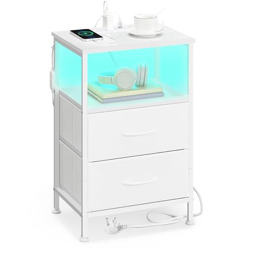 SONGMICS BELLAH Collection - Bedside Table with Charging Station, Side End Table with APP-Controlled Adjustable LED Lights, 1 Open Shelf and 2 Drawers, Bedroom, Cloud White and Snow White LGS302WH02