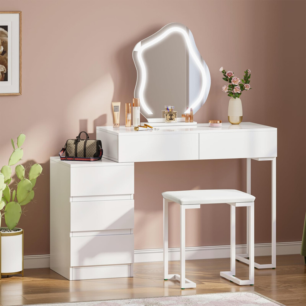 Dressing Table with Mirror and Stool Set, Modern Vanity Table Makeup Desk with 3 Color Lights Mirror & 5 Drawers, Bedroom White Dressing Table Set