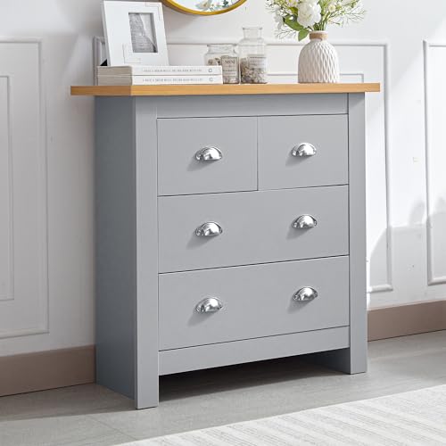 Chest of Drawers, 2+2 Drawer Bedroom Chest of Drawers MDF Chest of Draws Bedside Table Storage Cabinet for Bedroom Living Room Office Hallway Furniture Grey/Oak 35D x 79W x 81H cm