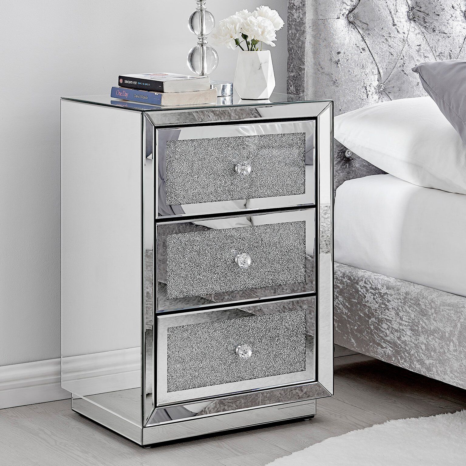 STELLA Mirrored Crushed Diamond Bedside Table Cabinet 3 Draws Bedroom Cabinet