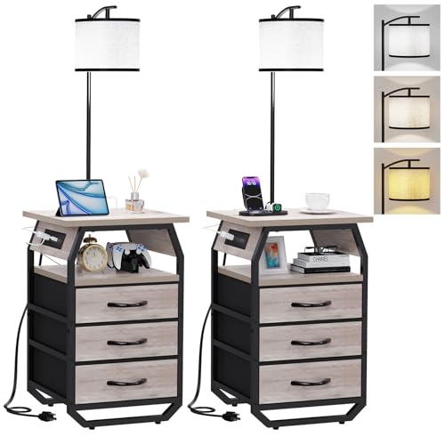 runjuly Set of 2 Floor Lamps with Table, Side Table Lamp 3 Color Temperatures, Drawers and Charger, Combination for Bedroom, Apartment Dorm - Greige