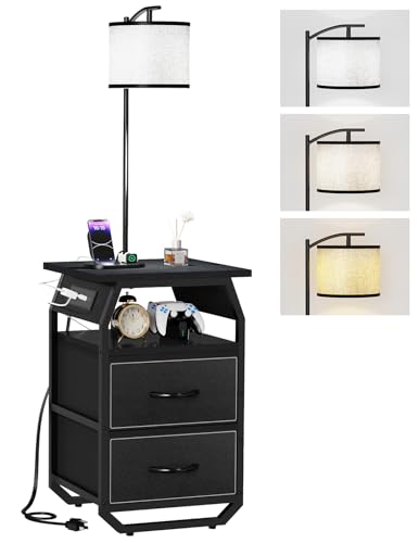 Runjuly - Floor Lamp with Table, End Tables with Attached Lamps 3 Color Temperature Bulb, Side Table with Lamp with 2 Drawers and Charging, Lamp Combo for Bedroom, Bedroom