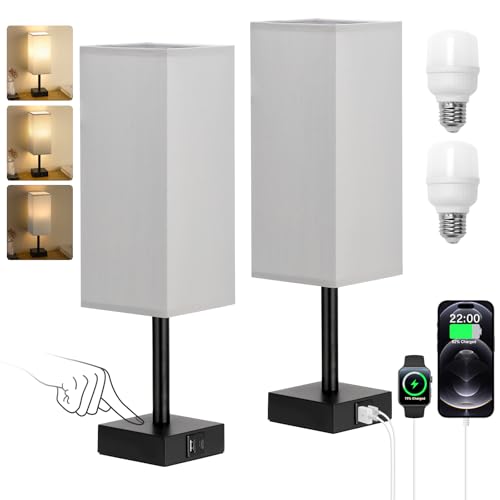 PBGMRT Bedside Lamps Set of 2 - Touch with USB-C+A Charging Ports, 3-Way Dimmable Table Lamp for Bedroom Living Room Grey Fabric Shade (Bulbs