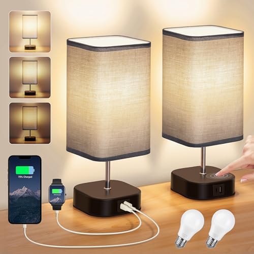 Bedside Lamps Set of 2 - Touch Lamps with USB-C+A Charging Ports, 3-Way Dimmable Table Lamp for Bedroom Living Room with Grey Fabric Shade (Bulbs Included)